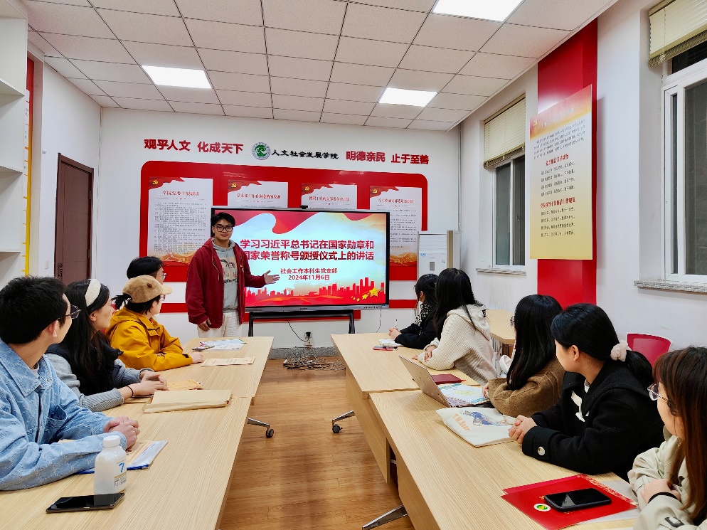 为深刻学习领悟习近平总书记重要讲话精神,11月6日,社会工作本科生党支部在学院6107会议室开展了“学习习近平总书记在国家勋章和国家荣誉称号颁授仪式上的讲话”的专题学习活动,支部成员艾力飞热提江和李正鑫同志担任领学人。