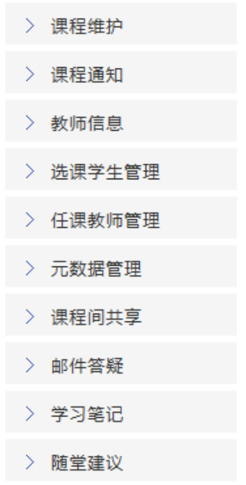 本栏目(如右图所示)用来管理选课学生和助教、发布课程通知、向他人共享本课程资源、引用他人共享给本课程的资源等。点击最上侧栏目【课程维护】,编辑课程介绍和课程大纲。