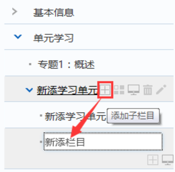 向下扩展按钮;用于自定义栏目的添加,如若创建与固定栏目(“基本信息”、“单元学习”、“随堂教学”等)平级的栏目,点击即可向下新增。 |