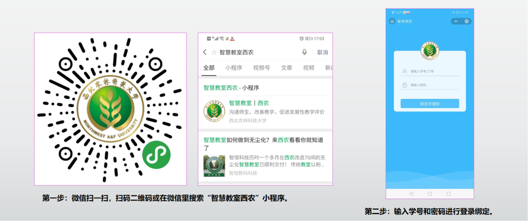 1、微信扫码登录“智慧教室 | 西农”小程序,或在微信搜索“智慧教室 | 西农”小程序。TIP:第一次使用,需绑定及授权;如果已经登录过可忽略这步。