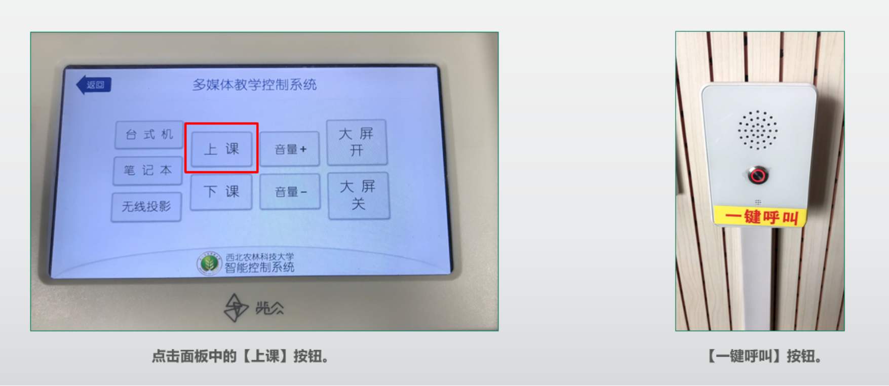 1、教师进入多媒体教室,点击面板中的【上课】按钮,打开教室设备。 (如遇设备问题,在教室中找到【一键呼叫】按钮,联系现场工作人员。)
