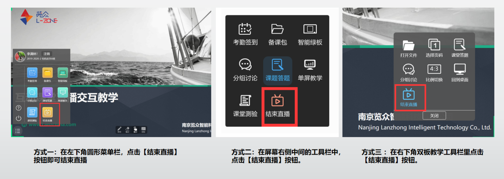 6、授课结束后,点击【结束直播】按钮,退出系统。教师可在以下方式中任选一种。