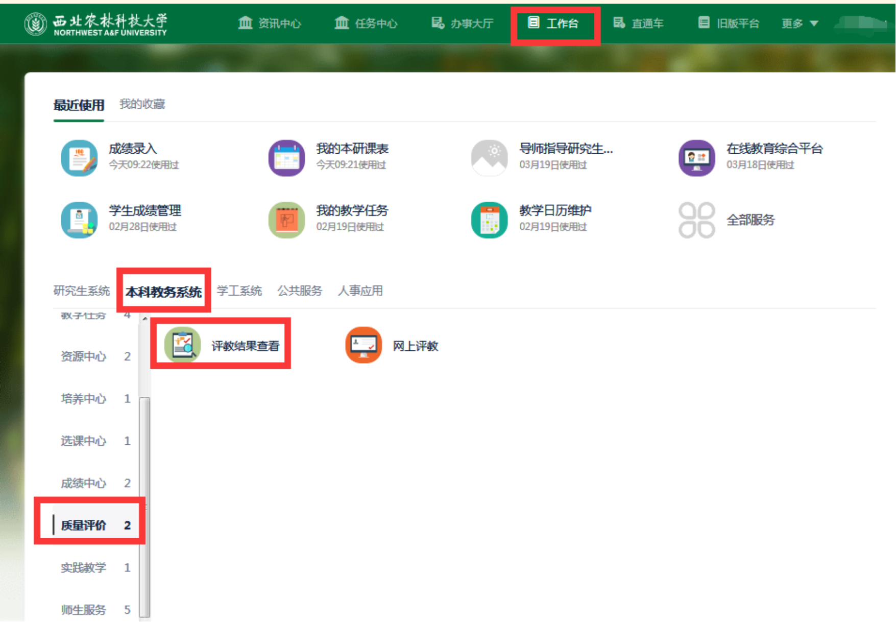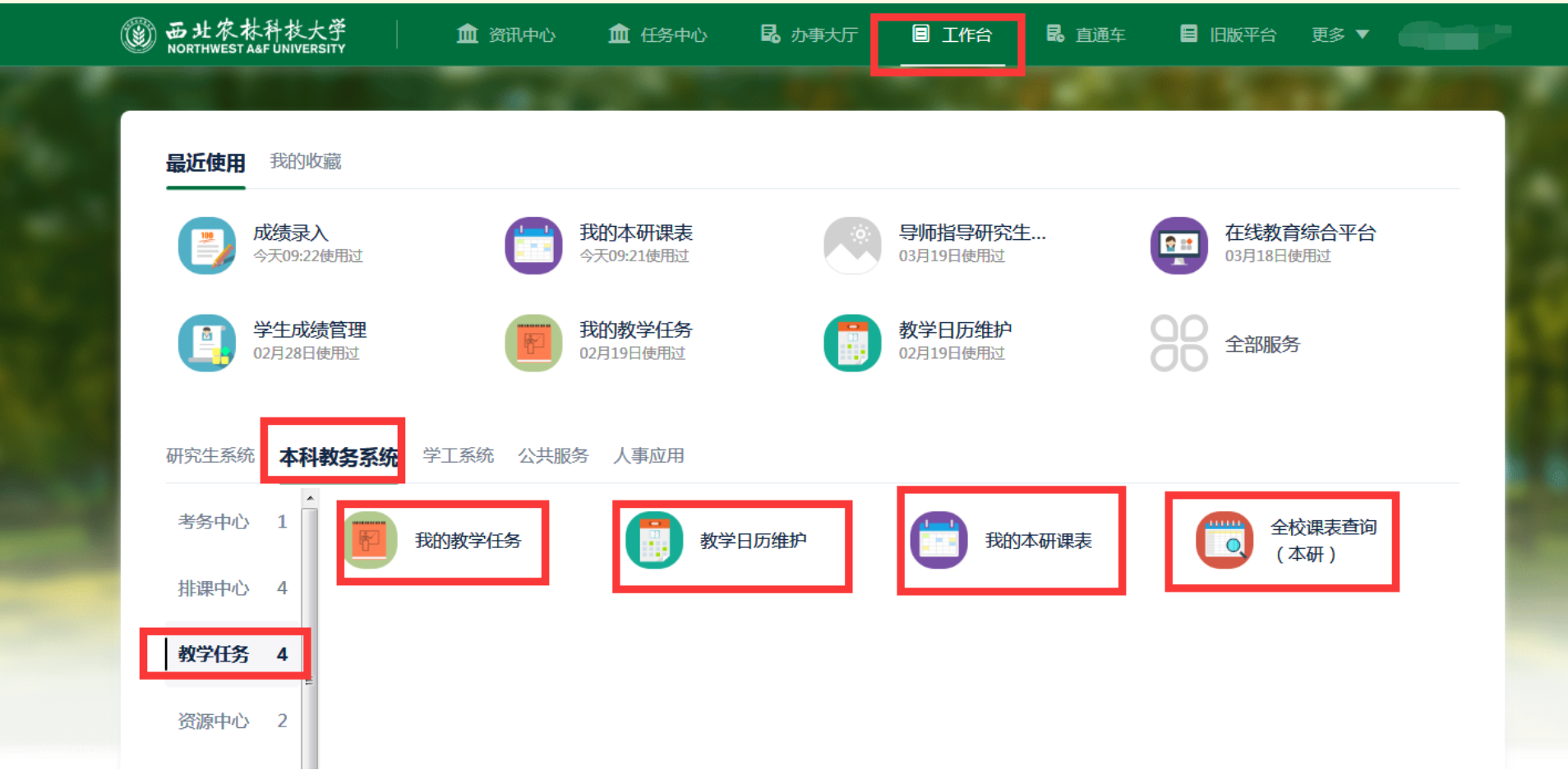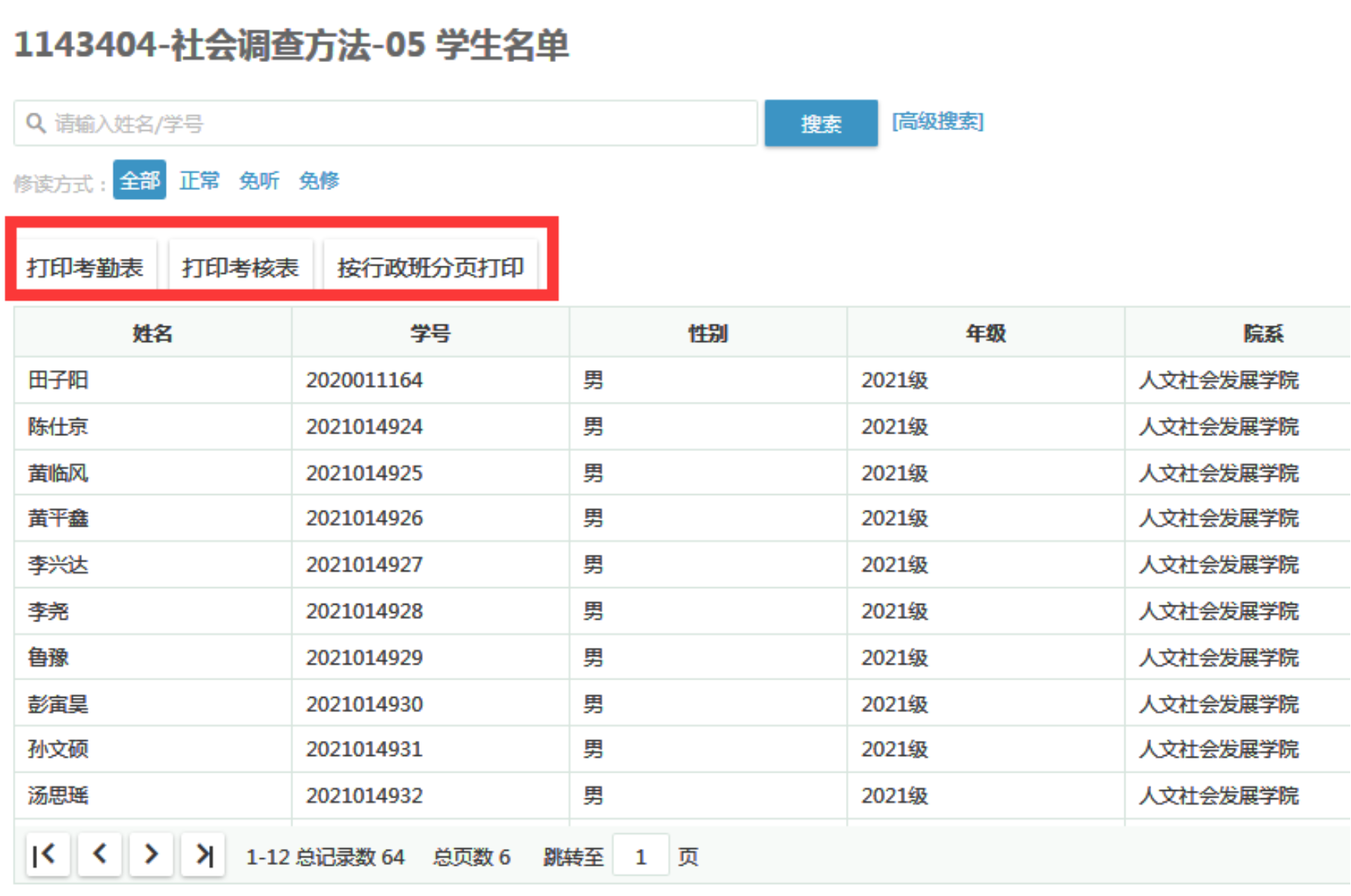 教师打印考核表、考勤表、录入成绩、查询全校课表、教学日历维护、成绩变更、查看评教结果、学生免听免修审核操作截图(要注意最上方学年学期的选择)