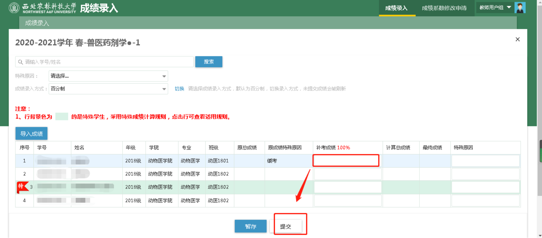 由于新旧系统替换,新系统中没有上学期的教学班数据,且未在新系统录入成绩,而是通过成绩迁移的方式将成绩迁移到了新系统,无法将缓考学生与补考学生在录入成绩系数区别开来,所以特殊原因为缓考的学生,需老师计算好总成绩后,再录入到补考成绩列。