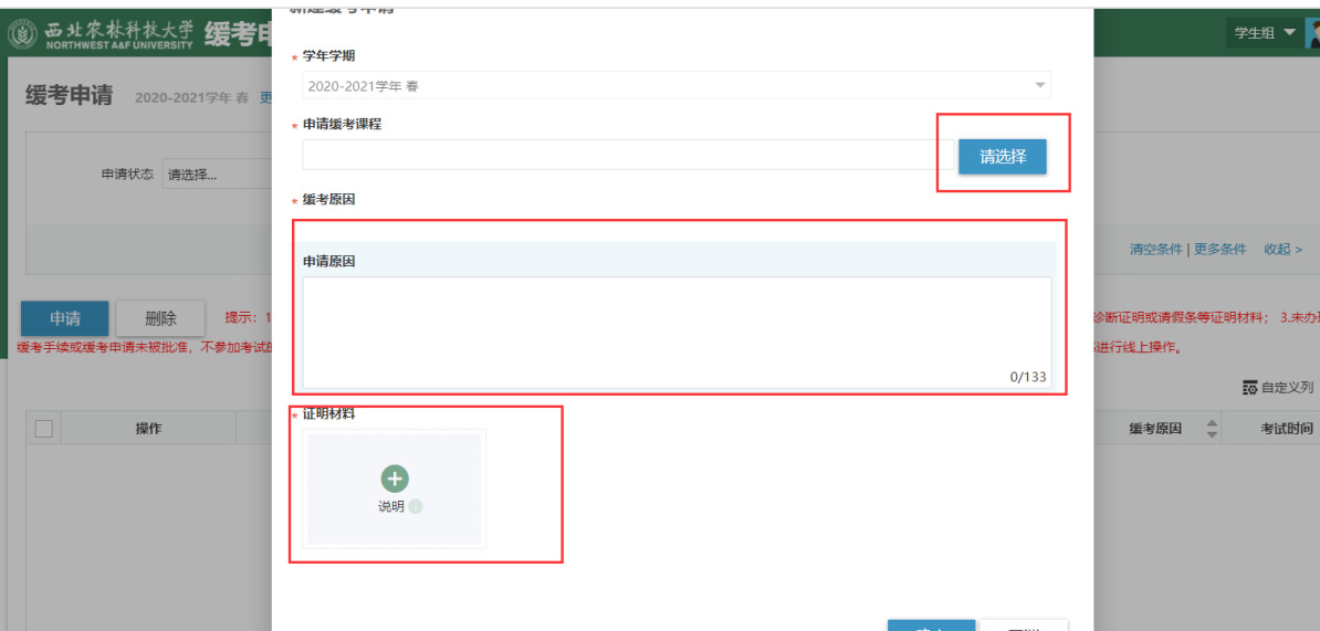 3.第三步:选择课程,填写申请理由,上传附件材料。