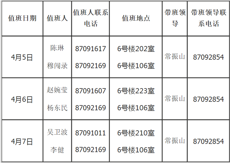 3.值班期间做好对学院办公区域的门窗防盗、水电(暖气管道)及消防安全等巡查,遇有意外情况时,及时向带班领导汇报