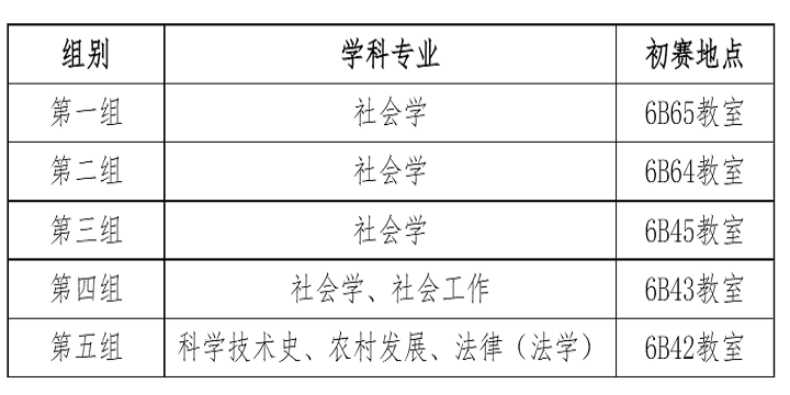 本次初赛按照论文所属学科专业和论文数量分为五组,各组初赛地点如下: