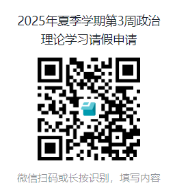 1.严格考勤制度。本次集体观影活动是加强理想信念教育、弘扬科学家精神的重要载体,请各党支部认真组织教职工参加集体观影活动。确因特殊情况需请假者,经党支部书记审批后,点击链接或扫码填写统计表单《2025年夏季学期第3周政治理论学习请假申请》(链接:https://f.wps.cn/g/Z2GPg2A7/)。