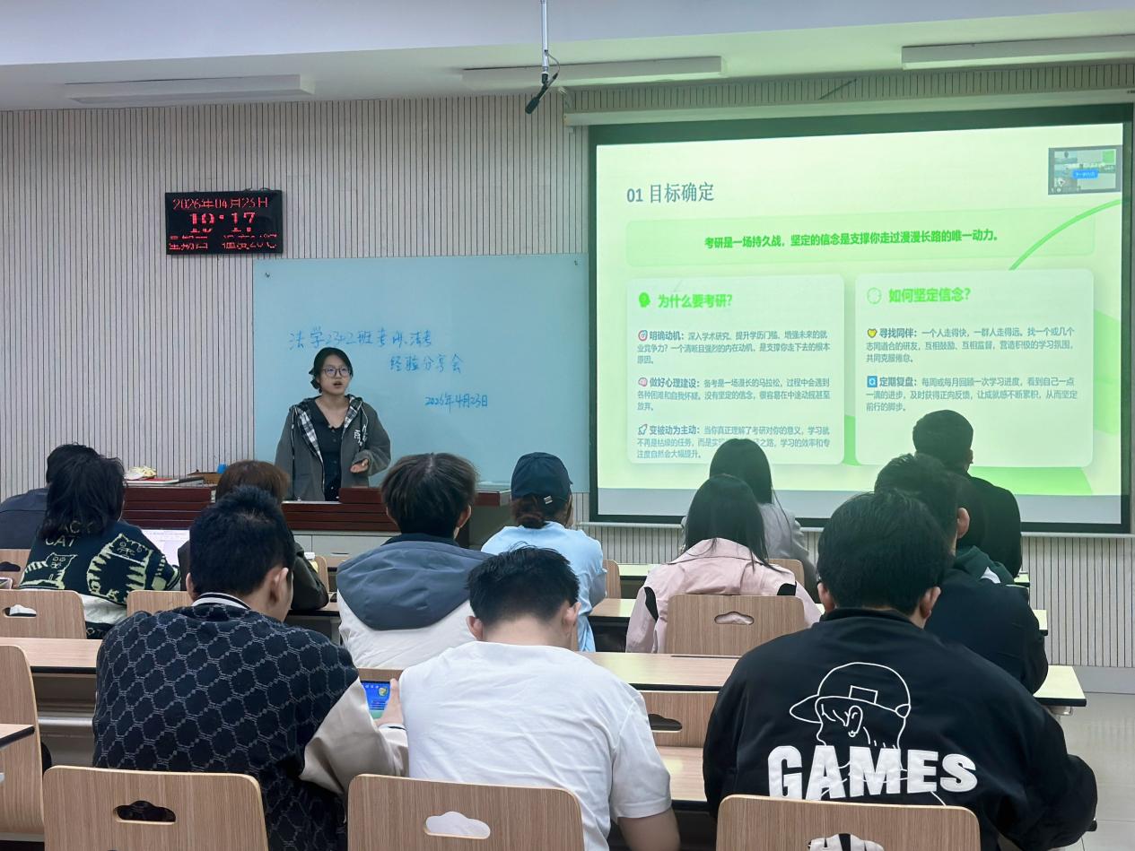 张烁同学则聚焦法考与考研“双选”难题,结合自身兼顾双考的经历,分享了合理分配复习时间、优化择校思路的技巧,重点讲解了复试环节的准备要点与应对方法,为有双考计划的同学提供了可借鉴的实践方案,破解了“双考如何兼顾”的常见困惑。