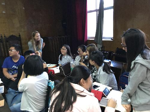 教学过程主要以“外教授课+小组讨论+分享展示+协调教师重难点提示与总结”的方式进行。围绕每次课程的主题,莫妮卡•可佐老师用详实的数据,生动的案例循循善诱,引发同学们对问题进行深入思考。讲课结束后,以负责该讲主题深入阅读的学生小组为核心,组织同学们分别就不同的问题进行讨论或者辩论。讨论过程中,两位老师会参与到各个小组与组员进行亲切交流,并引导同学们从多个视角思考问题。讨论结果的展示非常丰富多彩,可以通过语言或画图,可以是直接的观点陈述,也可以是评论、回应或辩论,这种方式既锻炼了同学们的英语口语表达能力,也让整个课堂变得活泼有趣,连平时怯于说英语的同学也在周围同学的带领下勇敢表达。除此之外,为增加同学们对主题的兴趣,老师会设计一些情景活动、填词游戏、拼词游戏,使同学们能够寓学于乐。为确保教学效果,莫妮卡•可佐老师在开始上完几次课之后还进行了中期匿名反馈评估,希望听到学生关于后续课程更多的建议(Stop-Start-Continue)。