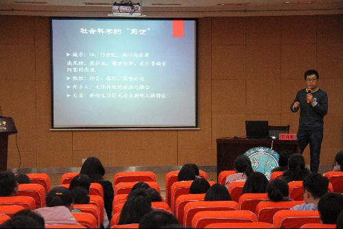 为进一步加深学生对于社会科学的认识, 12月7日晚,人文讲坛第45期在北绣北报告厅顺利举行。本期人文讲坛特邀袁君刚副教授带来题为“社会科学的‘秘密’”的讲座,学院百余名学生到场聆听。