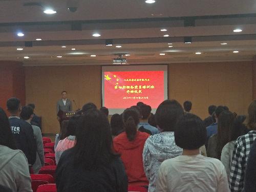 “亮身份·践承诺·树形象”主题实践活动启动仪式结束后进行了第七期预备党员培训班开班仪式,学生党员方天群代表全体党员做了表态发言。仪式结束后,王德连为全体学生党员做了“不忘初心,方得始终”为主题的党课。
