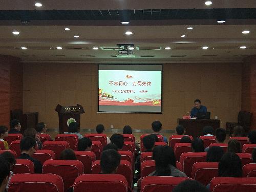 由“百年沧桑,一盘散沙,多方寻找民族救亡之路”到“大浪淘沙,苦难辉煌,担起民族救亡历史重任”,再到“百年复兴,不忘初心,建设社会主义现代化强国”,王德连以近代中国所经历的战争苦难为开端,以“蒋廷黻之问”为引导,从洪秀全到康梁到孙中山再到共产党的民族救亡之路,向同学们说明了中国共产党是建立在中华民族百年救亡、百年担当之中合理性、合法性、有担当的政党,是时刻牢记为人民谋幸福、为民族谋复兴的政党。不忘初心,方得始终,王德连从党的发展历程、党的苦难辉煌介绍了何为共产党员的初心,介绍了共产党为什么能带领中国人民走向复兴。他号召全体学生在实践中不忘初心、践行誓言,要加强对自身的思想引领、理论灌输,要始终牢记党员身份,明确宗旨,规范言行,争做合格党员。
