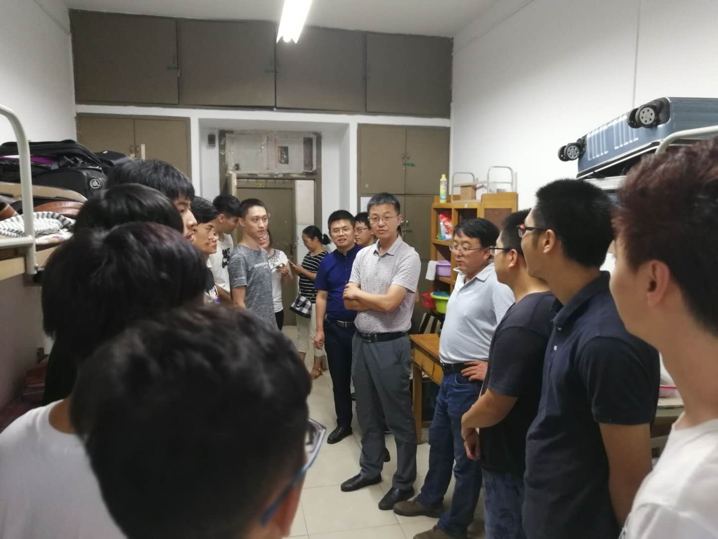 学院领导深入宿舍,慰问寄语新生暖人心。学院领导高度重视迎新工作,多次强调迎新不仅是学生报到入校,更要让学生有家一样的感觉,稳定“军心”才能搞好科研。现场迎新结束后,学院院长朱宏斌、党委书记王德连、副院长赵晓峰、常振山带领学院管理干部走进新生宿舍,询问新生适应校园住宿、饮食情况,并提醒新生有任何问题和困难记得第一时间找学院的老师解决。新生积极主动与学院领导交流,问及学习与研究生干部工作时,学院领导告诫新生,在研究生期间学习依然第一重要,但是也不能埋首苦读,要适当从事一些研究生干部工作,为广大研究生服务的同时也提高自身社交能力。