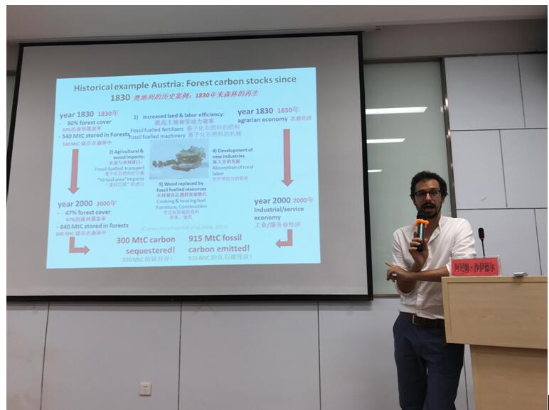 森林碳评估是向气候政策提供信息的一种重要指标,然而碳评估是否真正反应出了全球气候变化的态势呢?又有什么因素正在影响着森林的碳测评过程呢?讲座中,沙伊德尔博士以柬埔寨桔井省的森林复原计划为主线,围绕“森林碳评估与减排总目标的关系”、“碳评估的社会影响”两个问题对碳评估展开探讨,进而在生态学和社会学的交互框架之中,以社会生态系统的复合视角解读了温室气体(GHG)的排放机制,对碳评估方法的原理、优劣、学术提示等做出了详细阐释。随后,阿尼姆例举了奥地利的历史案例和当代轮垦制的例子,强调碳评估无法充分全面地反映环境变化态势。