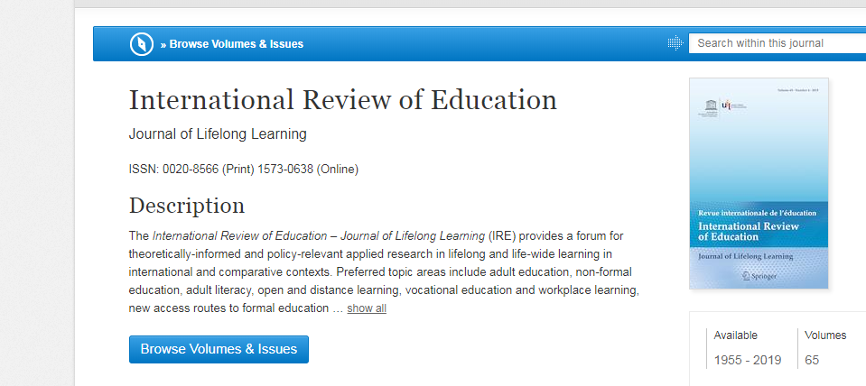 《The International Review of Education – Journal of Lifelong Learning (IRE) 》由联合国教科文组织终身学习中心( UNESCO Institute for Lifelong Learning (UIL))创办,由Springer(施普林格)集团出版发行。该期刊旨在通过发表终身学习领域的具有实证性的咨政类学术成果,为全球范围各个国家的政策制定者和研究者提供多元信息,促进知识的共享和经验的相互借鉴。期刊涉猎主题主要包括终身教育、成人教育,非正规教育,成人扫盲,开放和远程学习,职业教育和正规教育的新途径,终身学习政策以及终身学习范式的实践应用等。长期以来,该期刊促进了来自世界各个国家、特别是发展中国家和转型国家在终身教育领域的学术交流。
