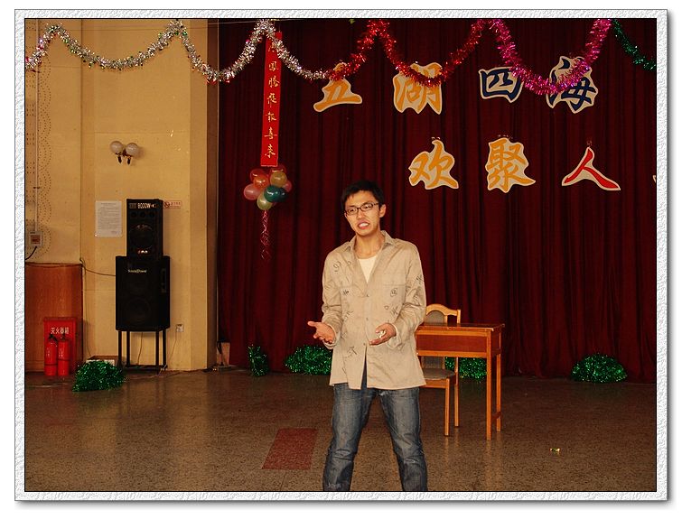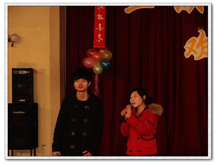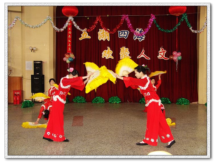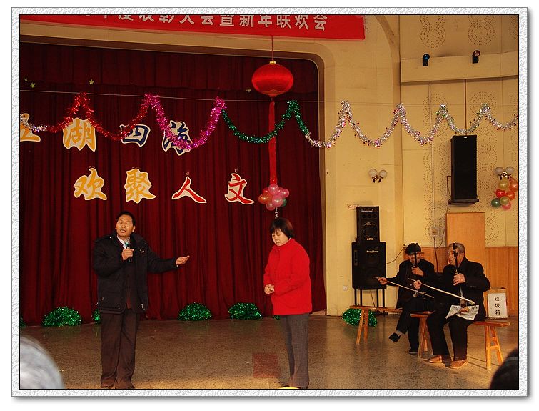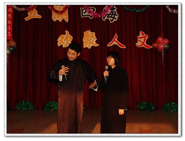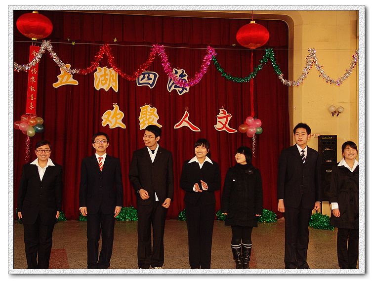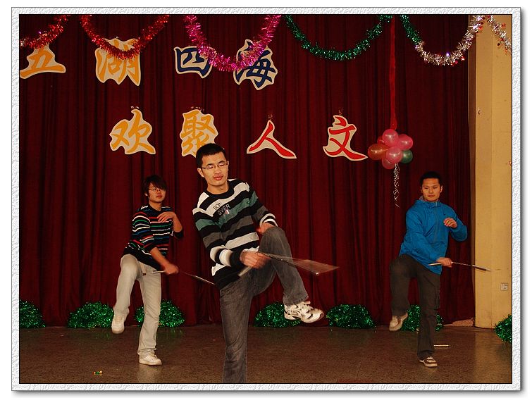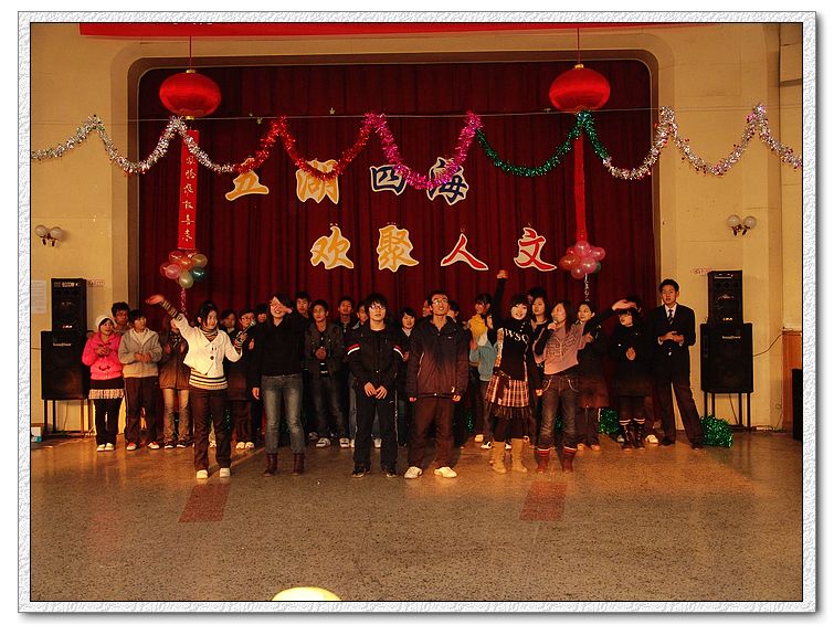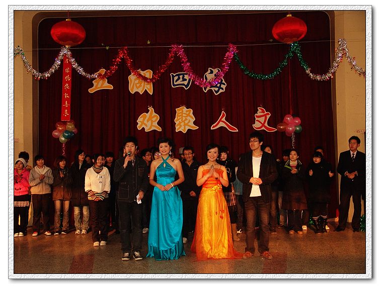 表彰会结束后,在欢快的民族舞《天地喜洋洋》中,人文学院2010新年联欢会拉开序幕。联欢会以“五湖四海,欢聚人文”为主题,来自不同省市的同学们以独具地方特色的节目为观众呈现了一场精彩的视听盛宴。方言版诗朗诵《再别康桥》引得观众笑声不断。震撼的双节棍表演、令人捧腹的相声《兵车行》、耐人寻味的话剧《警察与赞美诗》、独具创意的黑衣社舞和充满朝气的街舞将联欢会气氛一次次推向高潮,赢得在场师生的阵阵掌声。在戏曲联唱环节,同学们展示了黄梅戏、豫剧、京剧等精彩表演,充分展示了人文学院学生的艺术修养和功底,值得一提的是,来自我校曲艺协会的老师们还为大家带来了原汁原味的秦腔选段,让大家领略到了传统艺术的魅力。联欢会在合唱《明天会更好》中落下帷幕。
